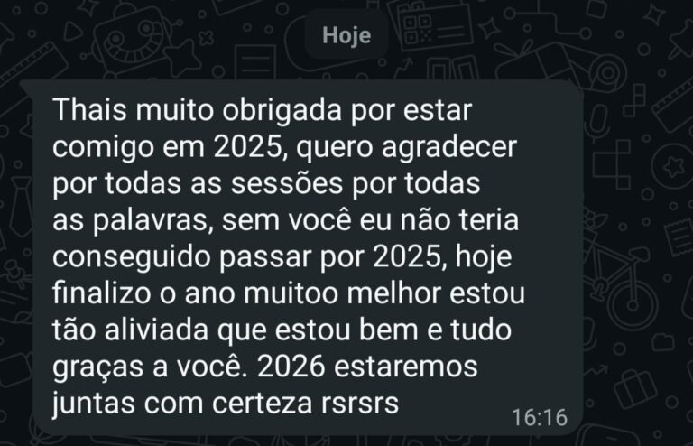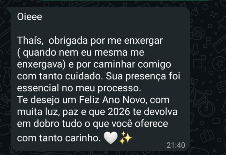 Publicado em A JuliaTrustindex verifica se a fonte original da avaliação é Google. Algumas pessoas fazem toda a diferença na nossa vida, e talvez nem imaginam o quanto. A Thaís é uma dessas pessoas! Tive muita sorte em conhecer o trabalho dela e ser sua paciente. Profissional maravilhosa, ser humano ímpar. Sou muito grata pelo seu trabalho maravilhoso ♥️Publicado em E DriTrustindex verifica se a fonte original da avaliação é Google. A Thais é incrível! Sinto que evolui muito desde que comecei a fazer terapia com ela. Hoje tenho mais clareza sobre as coisas que aconteceram e acontecem graças a ela. As sessões são leves e descontraídas. Ela tem uma sensibilidade muito grande pra te entender e te guiar nesse caminho. Recomendei ela pra todos meus amigos! Todo mundo deveria ter uma Thais na sua vida 🩷Publicado em L GiacominiTrustindex verifica se a fonte original da avaliação é Google. Amo a Thais! Uma profissional extremamente competente, comprometida com a minha melhora e equilibrio! Muito atenciosa, humana e especial. A metodologia do seu trabalho é muito eficaz e garante resultados que eu jamais imaginava! Recomendo fortemente 🙏Publicado em ElaineTrustindex verifica se a fonte original da avaliação é Google. Thais é uma ótima profissional.Publicado em A CarlaTrustindex verifica se a fonte original da avaliação é Google. Thais é uma profissional incrível, qualificada,consegue ter um entendimento de cada paciente de forma única com muito profissionalismo e acolhimento de cada história individual.Publicado em J correaTrustindex verifica se a fonte original da avaliação é Google. Thais é uma excelente profissional! Sempre muito atenciosa e acolhedora. Me sinto super seguro e confortável para conversar. Recomendo para quem busca apoio psicológico de qualidade.Publicado em S GuerraTrustindex verifica se a fonte original da avaliação é Google. Thais é uma profissional muito capacitada. É estudiosa e muito preparada. Sempre atenta aos detalhes e é muito acolhedora no contato. Eu recomendo de olhos fechados.Publicado em B DantasTrustindex verifica se a fonte original da avaliação é Google. Uma excelente profissional! me ajudou muito a ver novos horizonte e a me entender melhor. Tanto que minhas relações pessoais e profissionais melhoraram muito depois da sessões com a doutora Thais! Um trabalho excepcional, mais do que indicado!Publicado em G nejrTrustindex verifica se a fonte original da avaliação é Google. Me senti extremamente confortável durante as consultas!Publicado em L DanielTrustindex verifica se a fonte original da avaliação é Google. Muito bom o atendimento, me senti acolhido e foi reconfortante falar com a Dra. Thais sobre minhas questões. Virei cliente fiel, super recomendo. Muito obrigado Thais por me ajudar no meu momento de fragilidade.Carregue maisCertificado: TrustindexO selo verificado do Trustindex é o Símbolo Universal de Confiança. Apenas as melhores empresas podem obter o selo verificado que tem uma pontuação de avaliação acima de 4.5, com base nas avaliações dos clientes nos últimos 12 meses. Leia mais